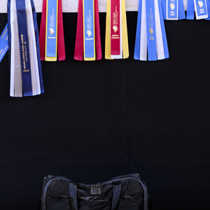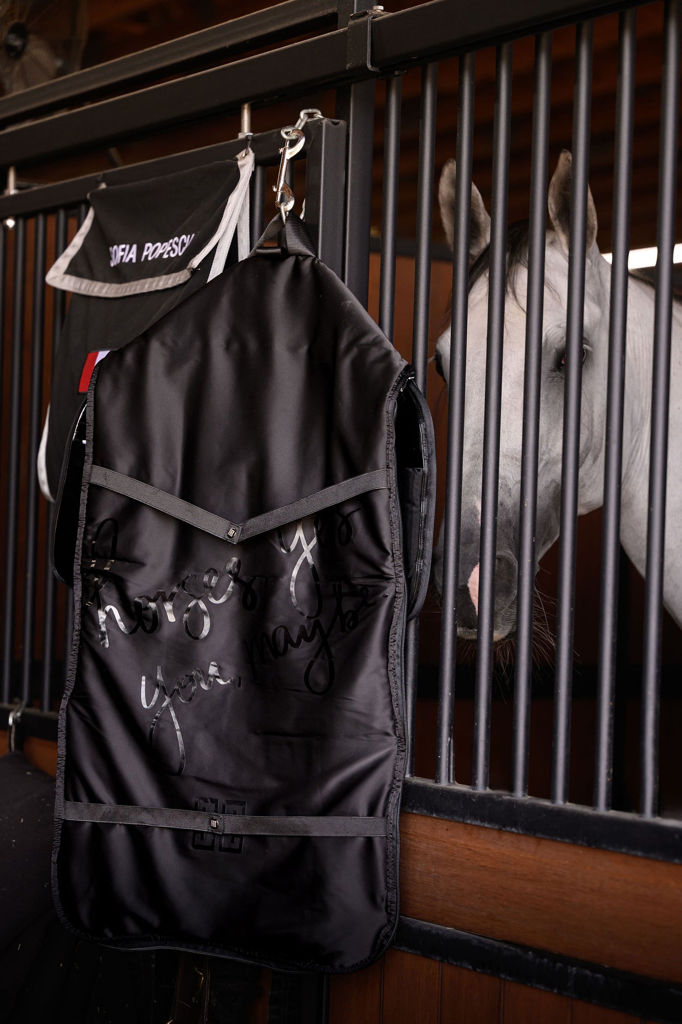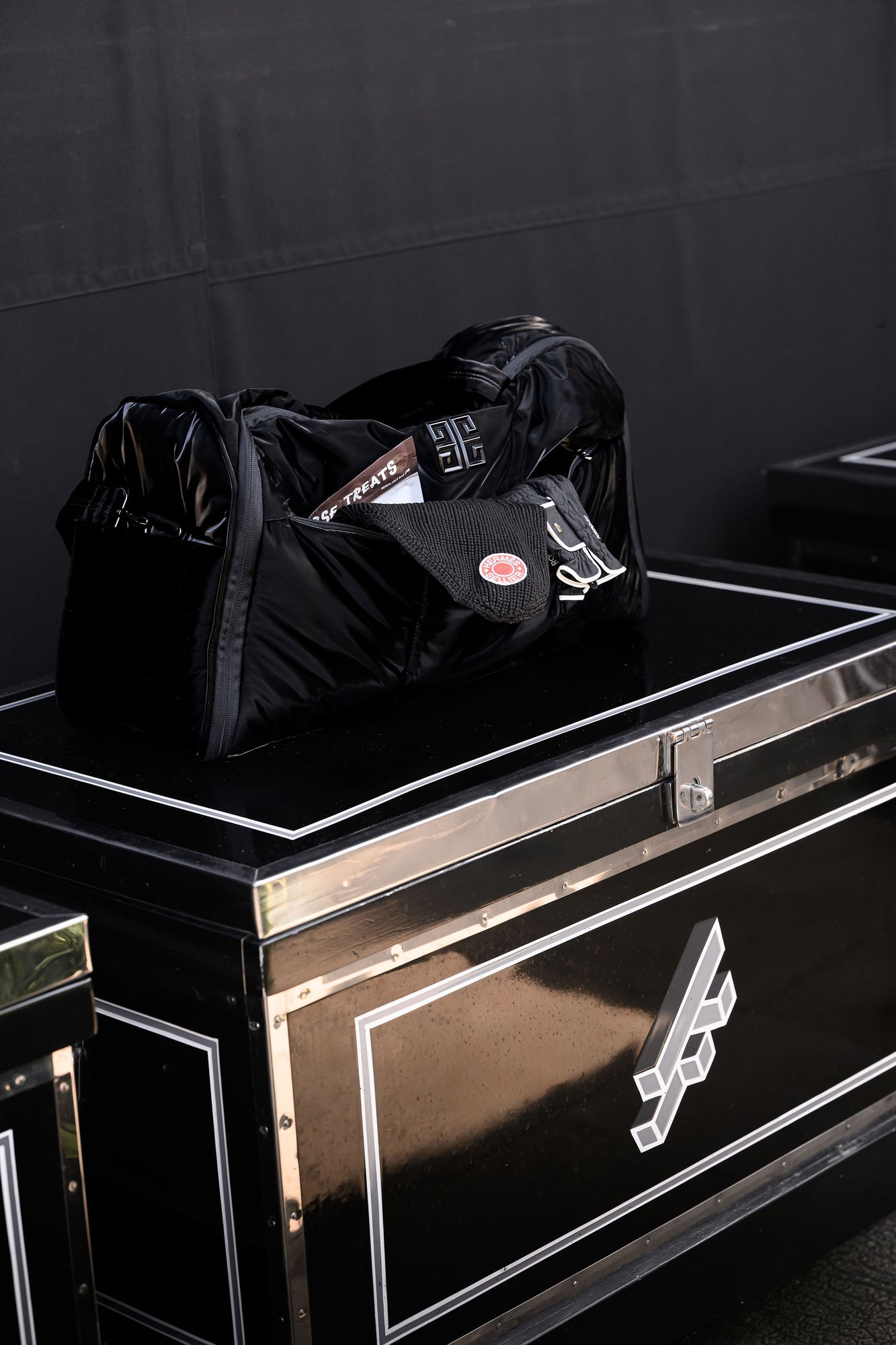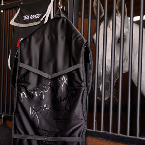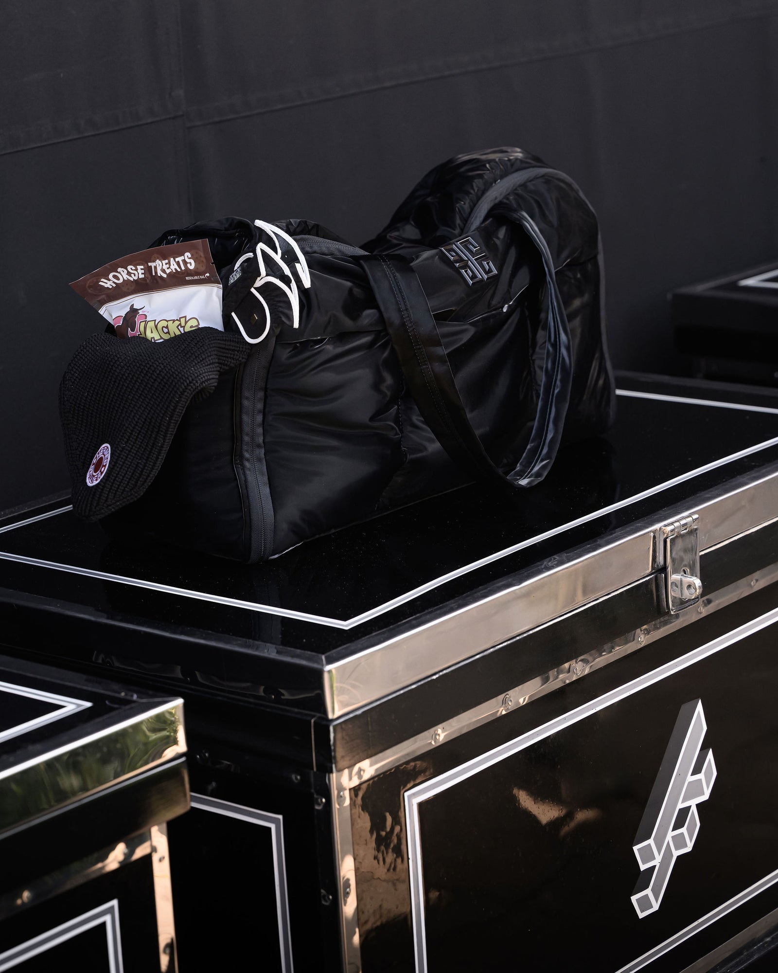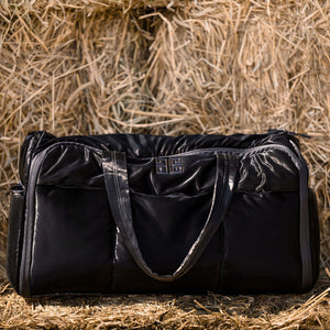 Unzip the duffle and lay it flat to reveal a full garment bag—ideal for keeping your show ring wardrobe pristine. Zip it back up, and it transforms seamlessly into a sleek, structured duffle designed to fit everything else you need for a show weekend.