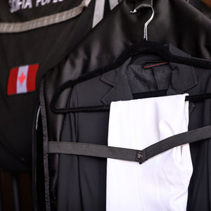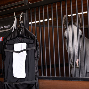 Meet the weekender that does it all. This innovative design doubles as a garment bag and duffle, making it the perfect barn-to-show and travel essential. Crafted with riders in mind, it keeps your show coats, breeches, and essentials organized, wrinkle-free, and ready to go.