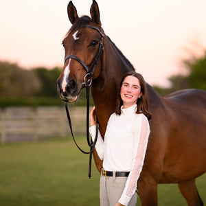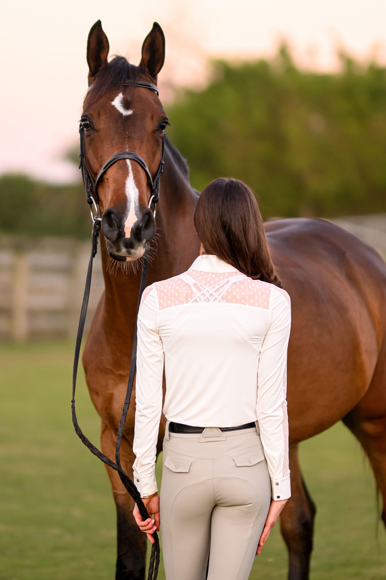 The Palm Beach features our new polka dot dura-mesh lace along the arms, shoulders, and upper back—designed to move with you without restriction. The mesh detailing remains subtly hidden beneath your show coat, offering function without compromising tradition.